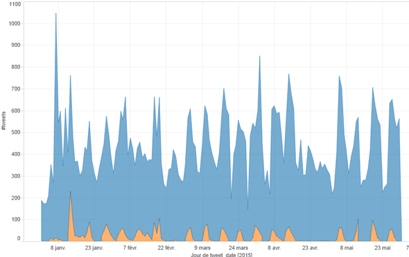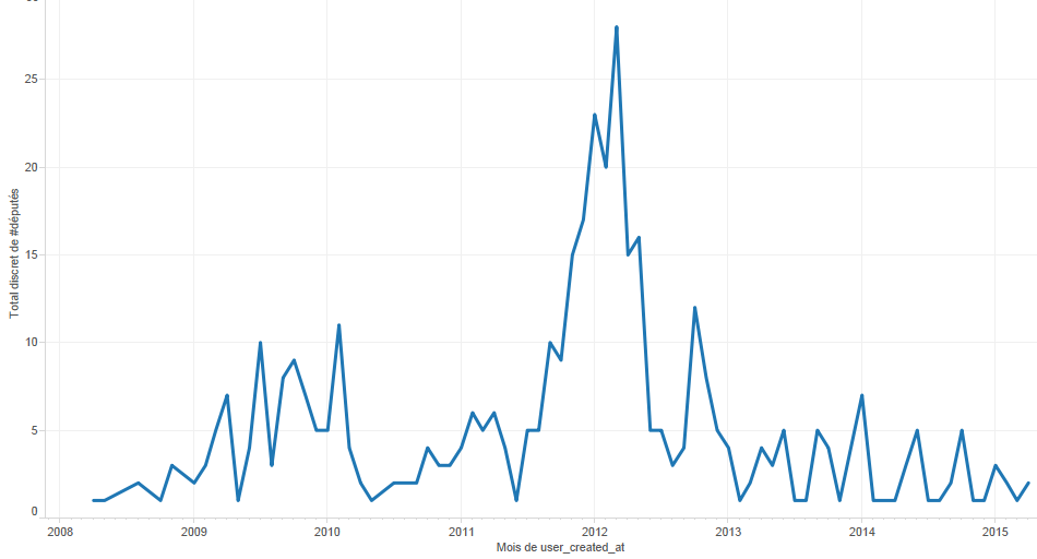 L’activité des députés sur Twitter est étroitement liée au calendrier politique. Nous observons une sur-activité de ces comptes en périodes électorales. Par exemple, plus d’un tiers des députés disposant d’un compte Twitter en 2015 l’ont créé dans l’année précédant les élections présidentielles de 2012. Les élections départementales et régionales sont au cœur des débats en ce premier semestre 2015