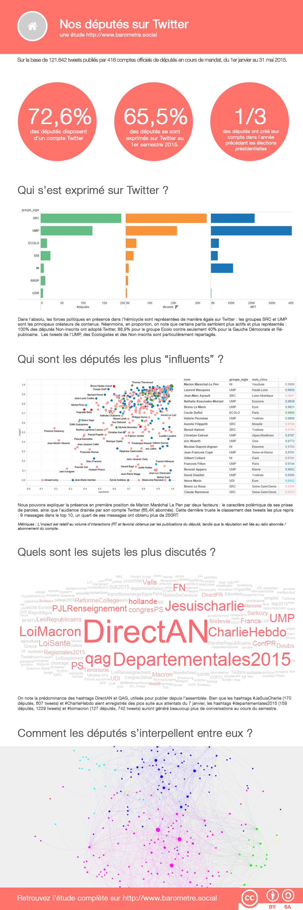 A l’aide de l’API publique mise à disposition par Twitter, nous avons collecté les tweets publiés sur les comptes officiels des députés en cours de mandat. Un jeu de données de 121.642 tweets a été constitué, contenant uniquement les messages publiés entre le 1er janvier et le 31 mai 2015. Nous avons croisé ces données avec des informations descriptives de chaque député (parti, groupe, place dans l’hémicycle…), issues du site NosDéputés.fr. Les analyses portent uniquement sur les contenus originaux produits par les députés (66.328 messages), excluant les repartages (retweets