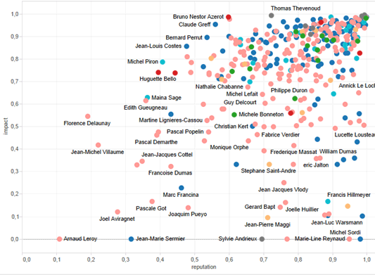 Twitter est un canal de communication qui est mis au service de stratégies d’influence. C’est pourquoi, nous avons choisi de mesurer « l’influence » de chaque député à partir de deux indicateurs : l’impact des publications et la réputation du député. Les deux indicateurs prennent des valeurs allant de 0 à 1. L’impact est relatif au volume d’interactions (RT et favoris) obtenus par les publications du député, tandis que la réputation est liée au ratio abonnés / abonnement du compte. Ainsi, la majeure partie des députés peuvent être considérés comme des utilisateurs « influents » sur Twitter (masse en haut à droite du graphique).