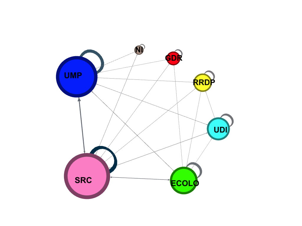 Les rapports de force entre partis politiques sont concrètement observables sur le réseau social en modélisant les citations des différents groupes politiques (à partir des mentions et des hashtags contenus dans les tweets des députés). On observe alors que la plupart des citations s’effectuent au sein même de ces groupes (récursivité) et que trois formations s’opposent très fréquemment (UMP, SRC, Ecolo).