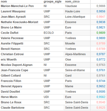 Lorsque l’on modélise l’ensemble des mentions des députés, au niveau de granularité le plus fin, nous observons ces échanges entre députés. La position de Claude Bartolone au sein du réseau est très évocatrice de son rôle de président de l’Assemblée Nationale puisqu’il est très fréquemment cité. Vous pouvez consulter deux graphes interactifs, identiques mais modélisés différemment : version standard, version circulaire.
