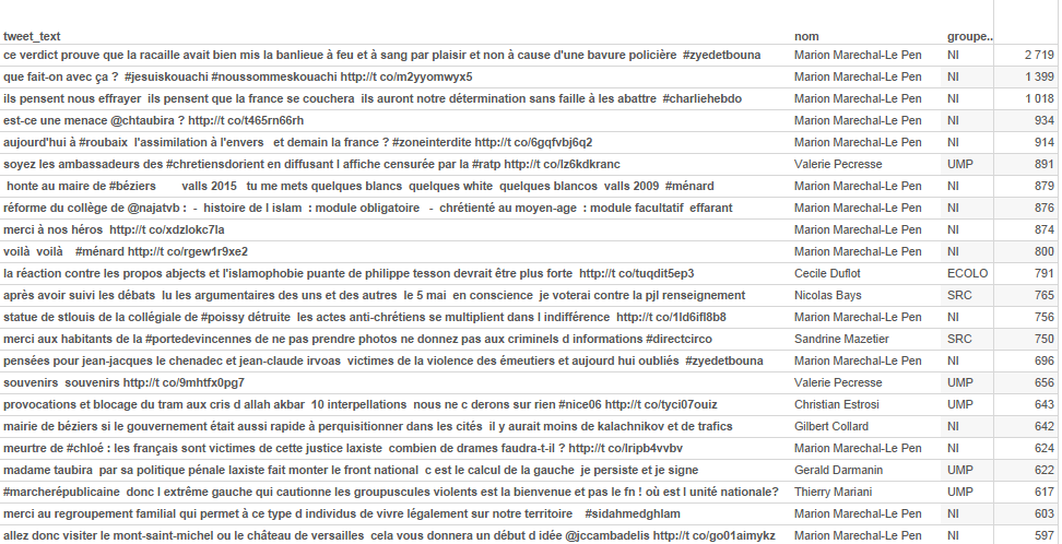 Nous observons une surreprésentation des Non-Inscrits dans ce classement. Nous pouvons expliquer la présence en première position de Marion Maréchal Le Pen par deux facteurs : le caractère polémique de ses prises de paroles, ainsi que l’audience drainée par son compte Twitter (65,4K abonnés). Cette dernière truste le classement des tweets les plus repris : 9 messages dans le top 10, un quart de ses messages ont obtenu plus de 250RT.